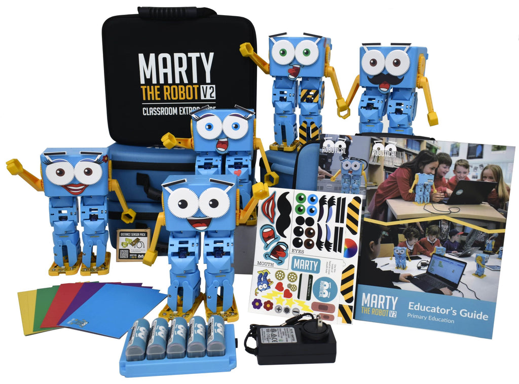 The new Marty V2 makes learning about robotics and coding fun and engaging. Program your Marty in various coding languages, from simple blocks in MartyBlocks (based on Scratch) and MartyBlocks Jr (based on ScratchJr) to Python and beyond, learn about sensors, and expand your robot. We’ve got lesson plans and activities for all skill levels freely accessible in the Learning Portal.