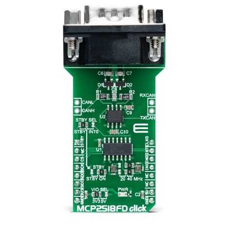 The MCP2518FD communicates with MCU using the SPI interface. In addition, the user can connect the external TX/RX signals to the CAN FD transceiver and CAN bus signals directly through the onboard headers on the right and left sides of the board. This Click board™ comes equipped with the standard DB-9 connector, making interfacing with the CAN bus simple and easy.