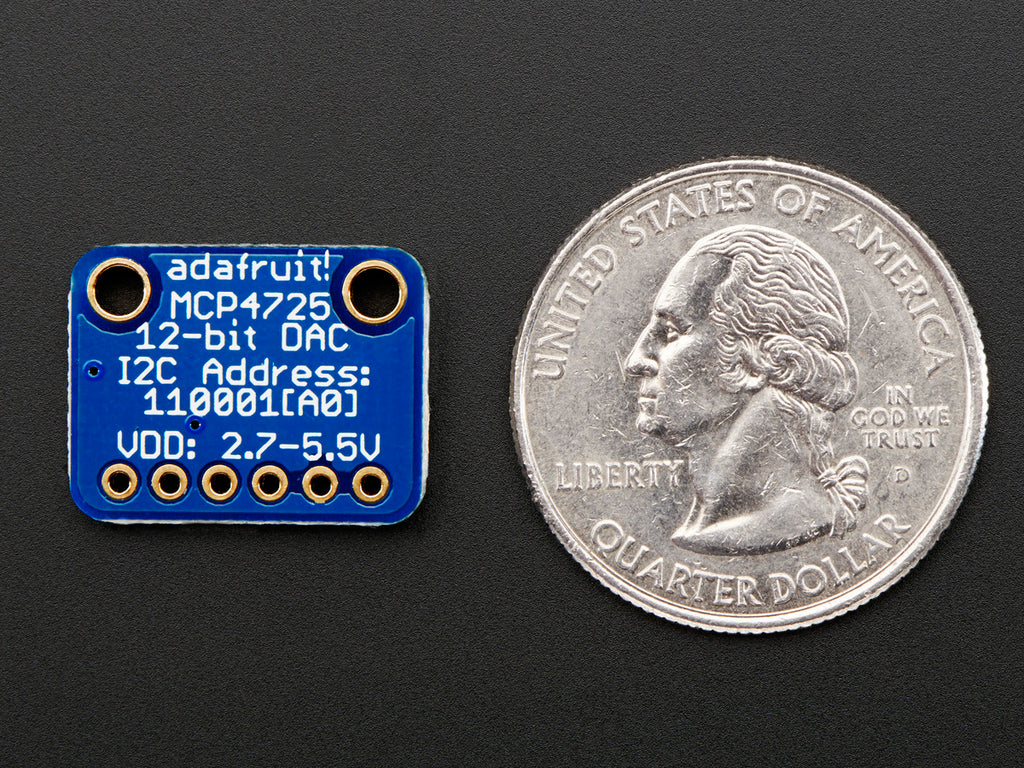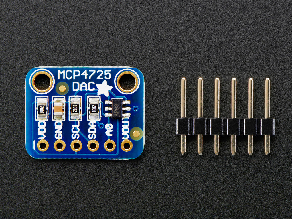 We break out the ADDR/A0 pin so you can connect two of these DACs on one I2C bus, just tie that pin of one high to keep it from conflicting. Also included is a 6-pin header, for use in a breadboard. Works with both 3.3V or 5V logic.