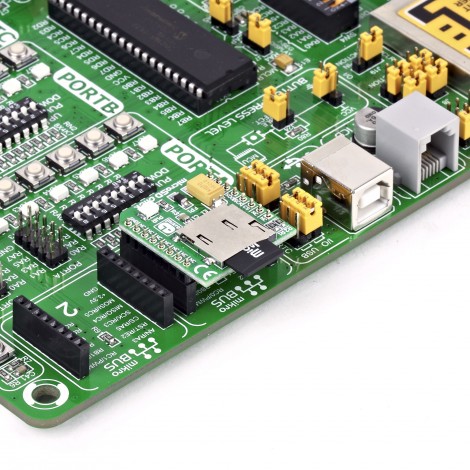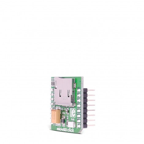 Type microSD Applications microSD click is ideal for storing and reading acquisition data, images, music, video and data files, or any other application where fast mass storage is needed. On-board modules microSD card slot Key Features microSD card slot for microSD cards used as a mass storage media for portable devices Interface SPI Compatibility mikroBUS Click board size S (28.6 x 25.4 mm) Input Voltage 3.3V