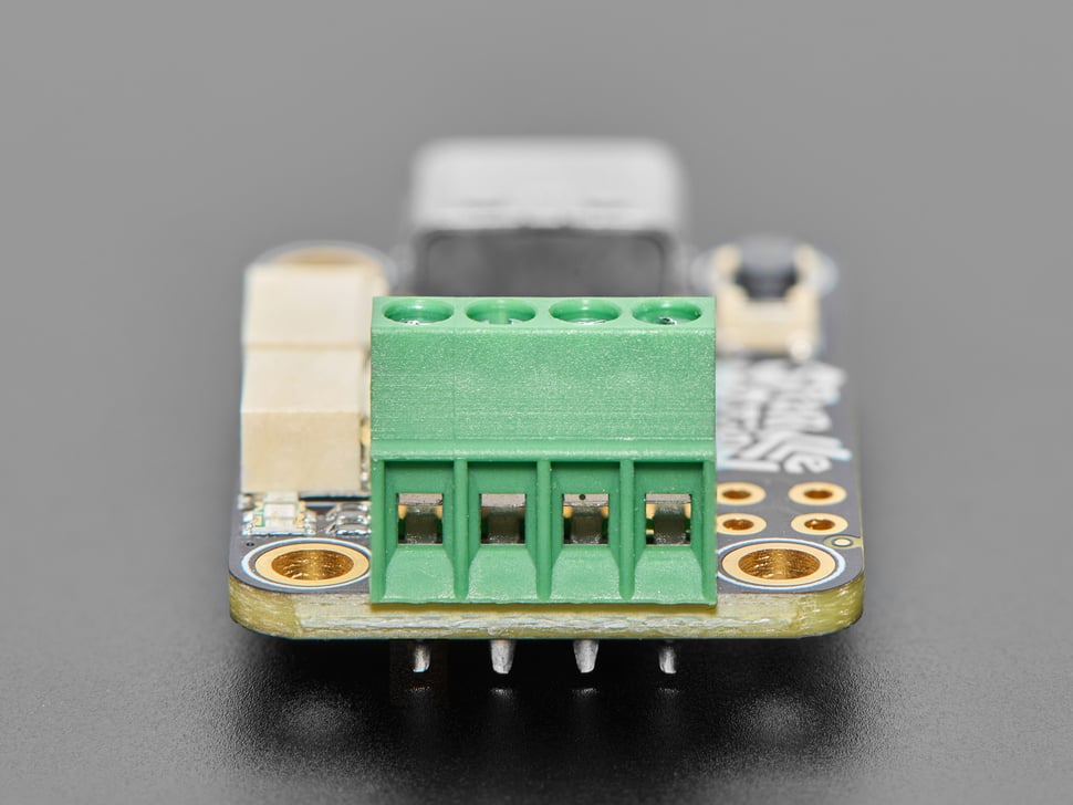 This version includes a pre-soldered terminal block, that means no soldering is required to get started: a small screwdriver will get you going instantly. However, the board is bulkier and the terminal block overlaps half of one of the breakout pads.