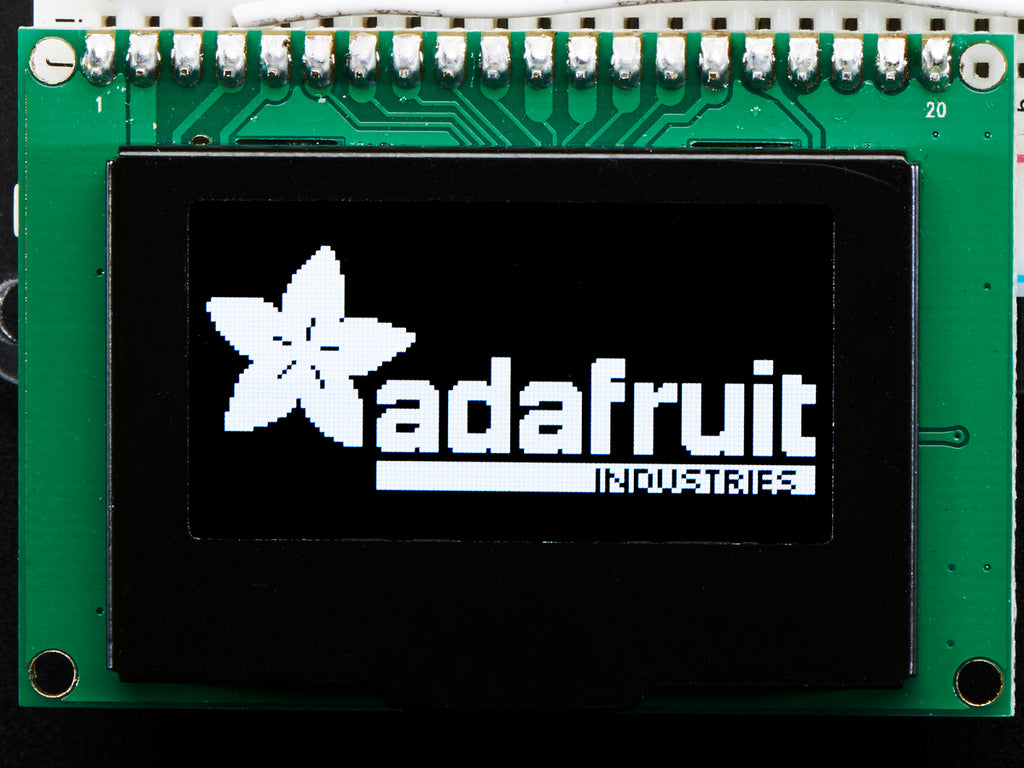Getting started is easy! We have a detailed tutorial and example code in the form of an Arduino library for text and graphics. You'll need a microcontroller with more than 512 bytes of RAM since the display must be buffered. The library can print text, bitmaps, pixels, rectangles, circles and lines. It uses 512 bytes of RAM since it needs to buffer the entire display but its very fast! The code is simple to adapt to any other microcontroller.