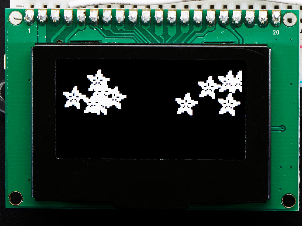 If you've been diggin' our monochrome OLEDs but need something bigger, this display will delight you! These displays are 1.54" diagonal, and very readable due to the high contrast of an OLED display. This display is made of 128x64 individual white OLED pixels, each one turned on or off by the controller chip. Because the display makes its own light, no backlight is required. This reduces the power required to run the OLED and is why the display has such high contrast; we really like this graphic display for its crispness!