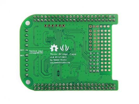 The Motor Bridge Cape features bi-directional motor control using two TB6612FNG integrated dual H-bridge, so it can control two stepper motors or four brushed DC motors with 6~15V DC power and about 1A current draw per motor. The cape provides 5V regulated power to BBG or BBB with a max input voltage of 15V. It also has six servo control interface and six expand IO. All the features are provided by the on board STM32F0 coprocessor. The coprocessor can communicate with BeagleBone by I2C or UART interface.