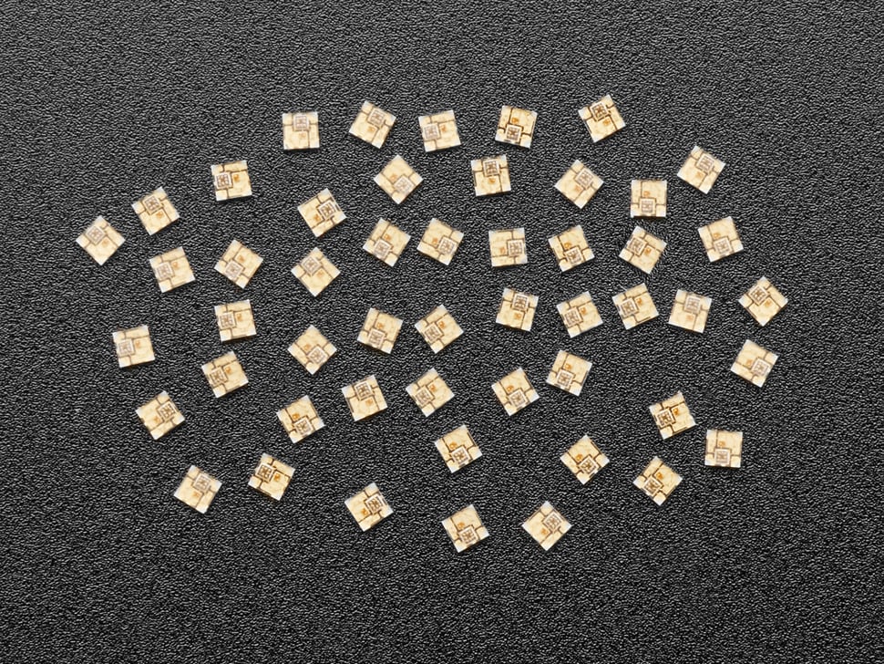 Create your own tiny yet high-density arrangement of smart LEDs using our NeoPixel strip and pixels, which utilize the same integrated LED type. This incredibly small RGB LED, measuring 1.1mm x 1.1mm, is specifically designed for surface-mount soldering and provides a compact solution for integrating multiple bright LEDs into any design. These LEDs are remarkably small - typically, you'll find 20x larger 5050 LEDs or 10x larger 'mini' NeoPixels in the market.