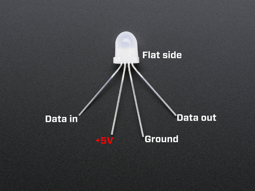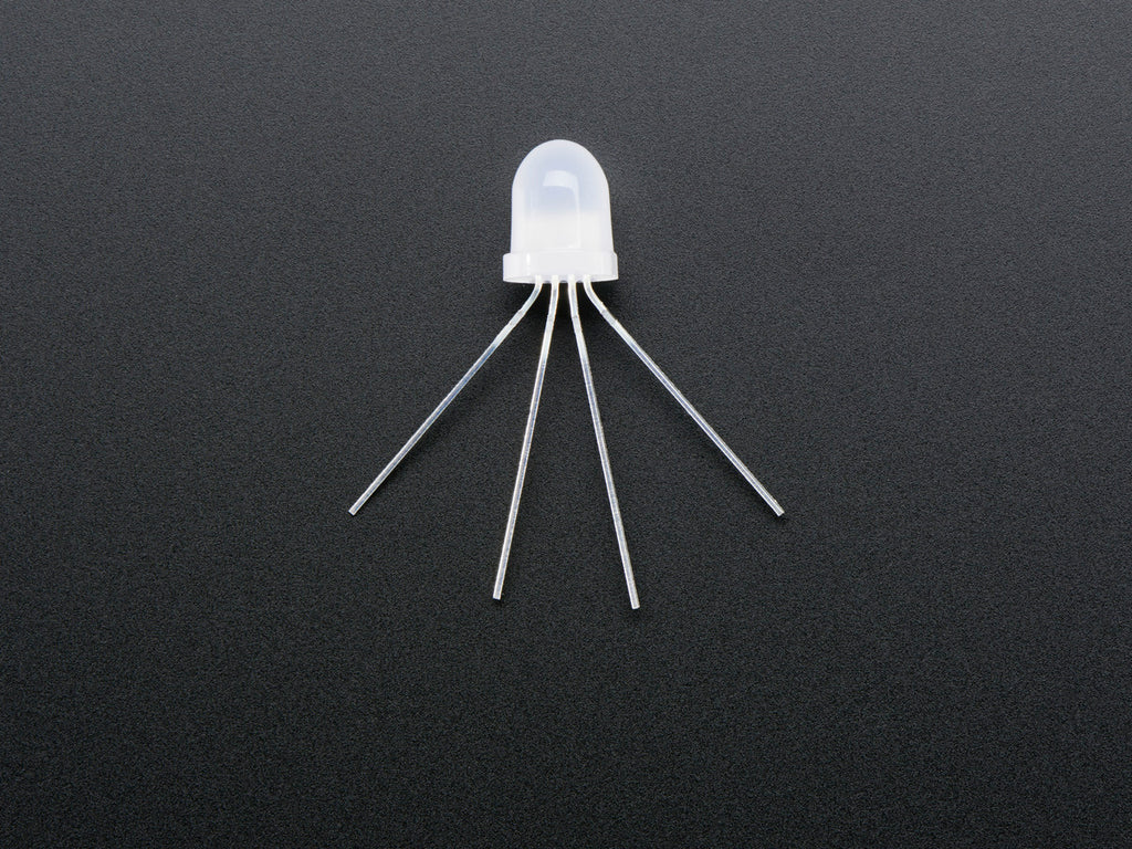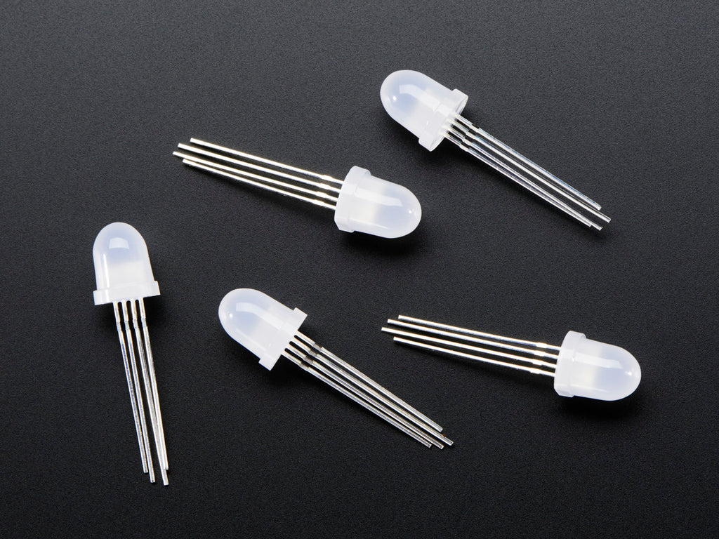 LOLwut? NeoPixels in through-hole variety? Oh yes, we haz them! If you like NeoPixel strips you'll luv these 8mm diffused through-hole NeoPixels. All the single-pin-controlling-hundreds-of-LEDs goodness in a breadboard friendly format. Each LED looks just like your classic through-hole 8mm RGB LED with 4 legs, but instead of just red/green/blue there's a little chip inside that can control the LED with high speed PWM for 24-bit color.