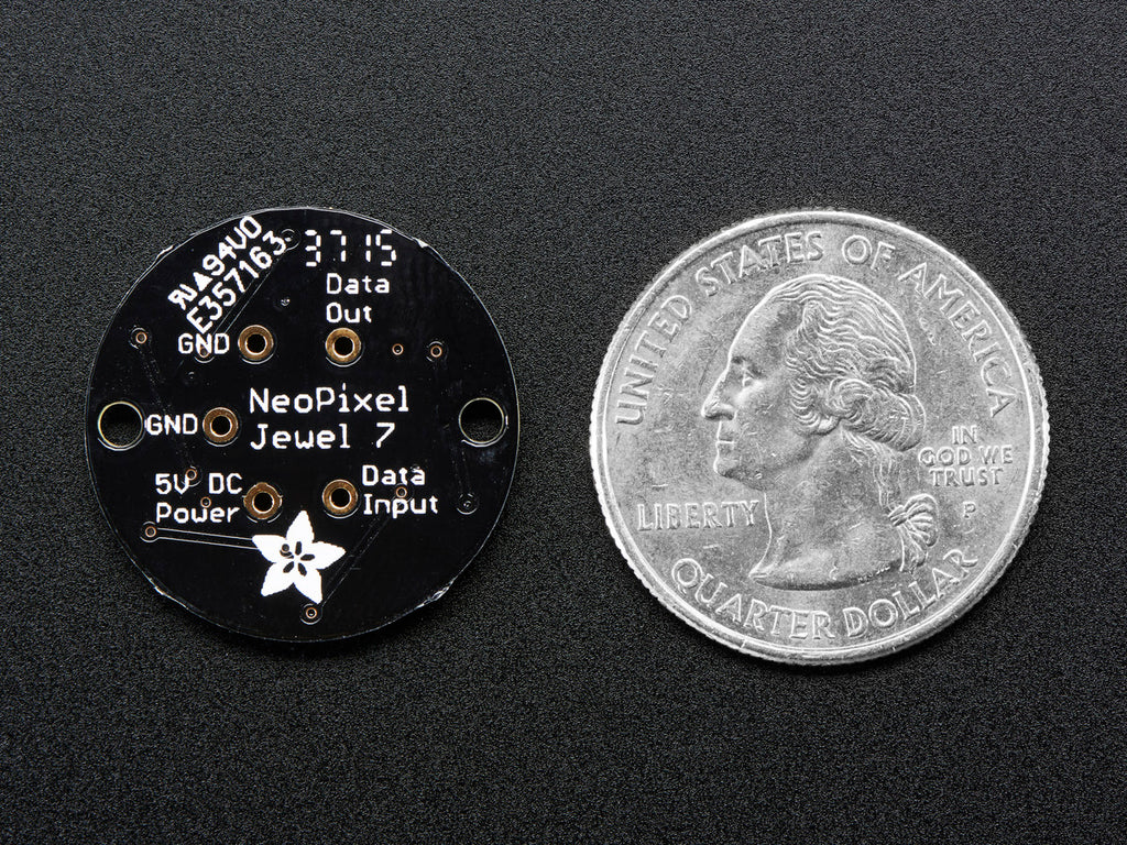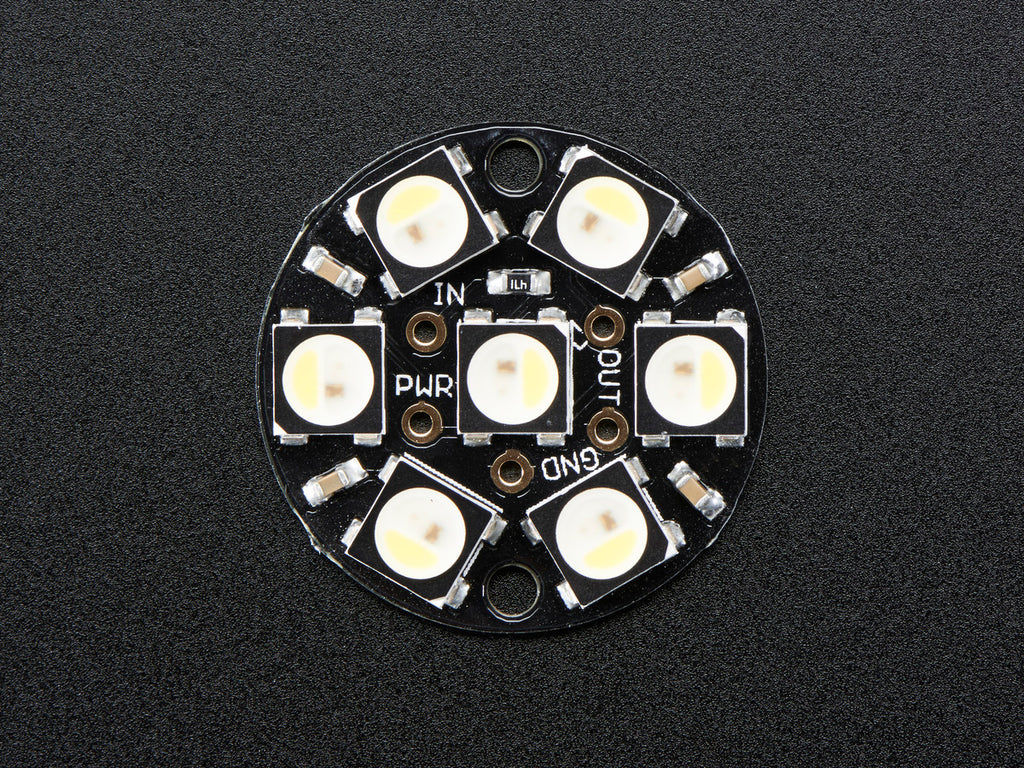 We fit seven of our tiny 5050 (5mm x 5mm) smart RGBW LEDs onto a beautiful, round PCB with mounting holes and a chainable design to create what we think is our most elegant (and evening-wear appropriate) NeoPixel board yet. Use only one microcontroller pin to control as many as you can chain together! Each LED is addressable as the driver chip is inside the LED. Each one has ~18mA constant current drive so the color will be very consistent even if the voltage varies, and no external choke resistors are required making the design slim. Power the whole thing with 5VDC (4-7V works) and you're ready to rock.