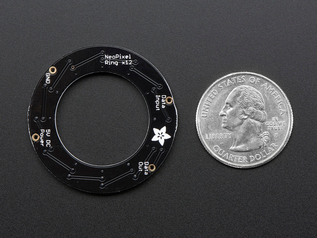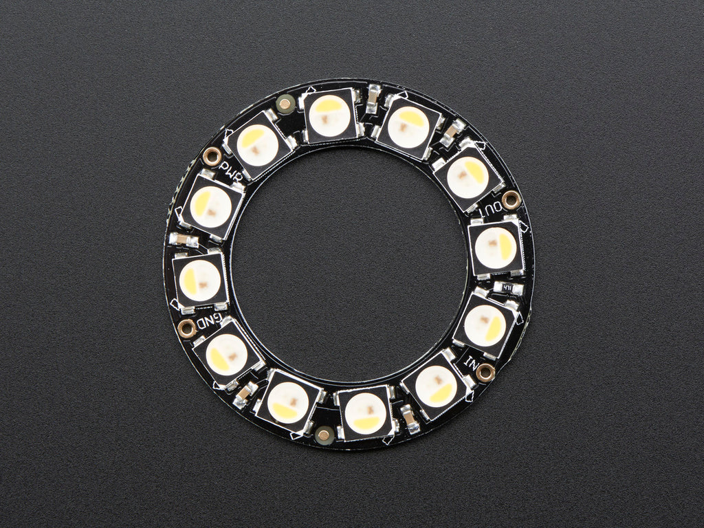 12 ultra bright smart LED NeoPixels are arranged in a circle with 1.45" (37mm) outer diameter. The rings are 'chainable' - connect the output pin of one to the input pin of another. Use only one microcontroller pin to control as many as you can chain together! Each LED is addressable as the driver chip is inside the LED. Each one has ~18mA constant current drive so the color will be very consistent even if the voltage varies, and no external choke resistors are required making the design slim. Power the whole thing with 5VDC and you're ready to rock.