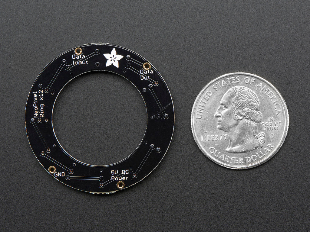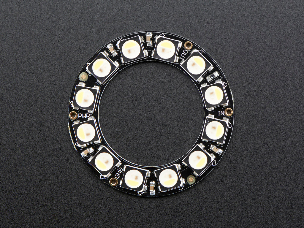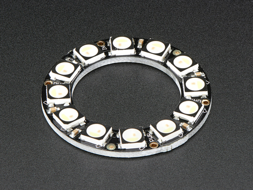 12 ultra bright smart LED NeoPixels are arranged in a circle with 1.45" (37mm) outer diameter. The rings are 'chainable' - connect the output pin of one to the input pin of another. Use only one microcontroller pin to control as many as you can chain together! Each LED is addressable as the driver chip is inside the LED. Each one has ~18mA constant current drive so the color will be very consistent even if the voltage varies, and no external choke resistors are required making the design slim. Power the whole thing with 5VDC and you're ready to rock.