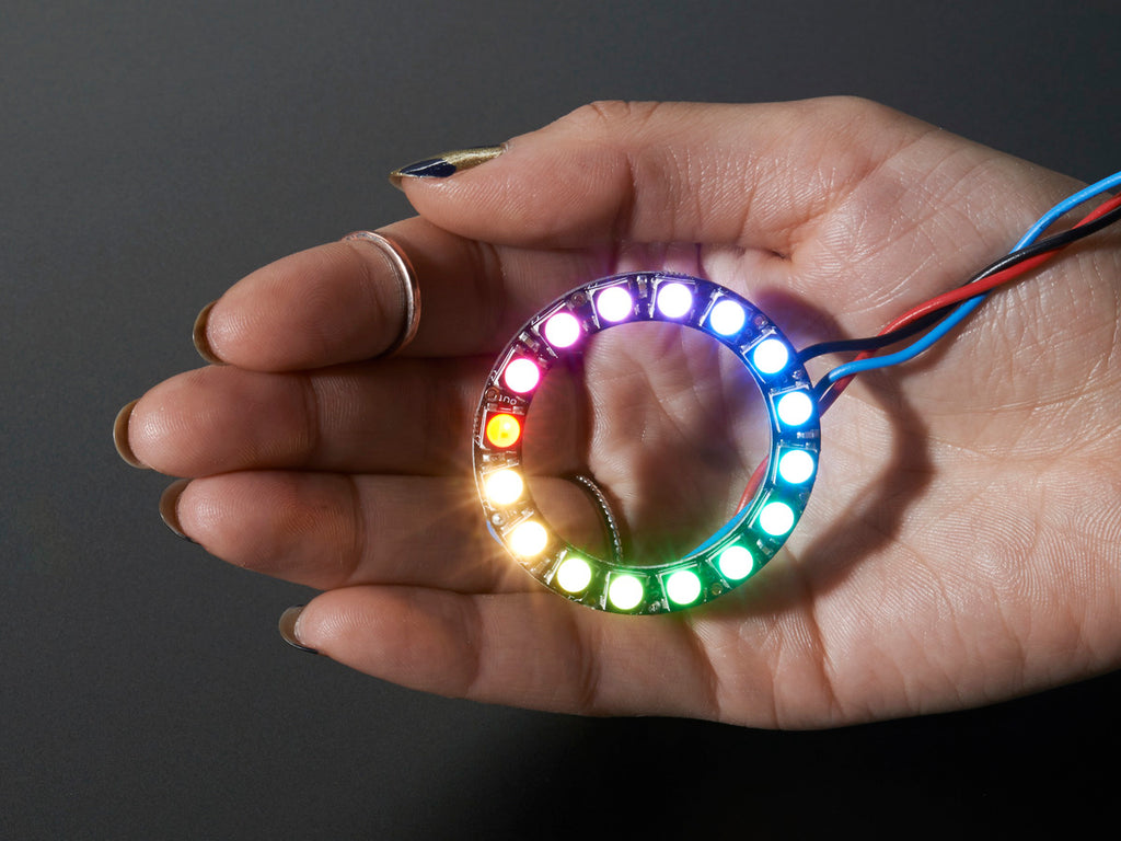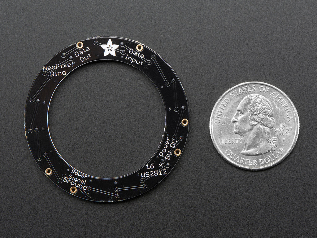 16 ultra bright smart LED NeoPixels are arranged in a circle with 1.75" (44.5mm) outer diameter. The rings are 'chainable' - connect the output pin of one to the input pin of another. Use only one microcontroller pin to control as many as you can chain together! Each LED is addressable as the driver chip is inside the LED. Each one has ~18mA constant current drive so the color will be very consistent even if the voltage varies, and no external choke resistors are required making the design slim. Power the whole thing with 5VDC and you're ready to rock.