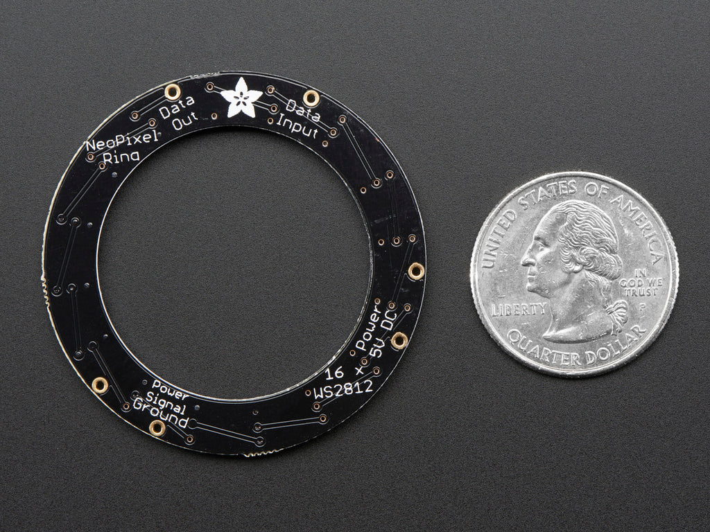 16 ultra bright smart LED NeoPixels are arranged in a circle with 1.75" (44.5mm) outer diameter. The rings are 'chainable' - connect the output pin of one to the input pin of another. Use only one microcontroller pin to control as many as you can chain together! Each LED is addressable as the driver chip is inside the LED. Each one has ~18mA constant current drive so the color will be very consistent even if the voltage varies, and no external choke resistors are required making the design slim. Power the whole thing with 5VDC and you're ready to rock.