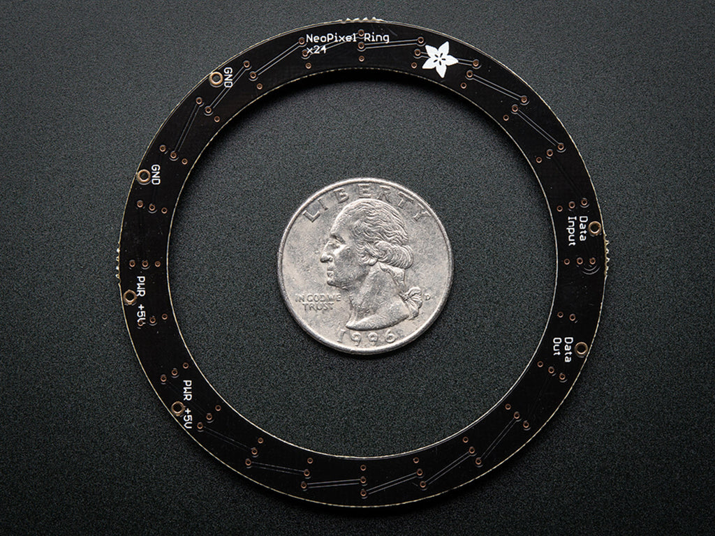 Round and round and round they go! 24 ultra bright smart LED NeoPixels are arranged in a circle with 2.6" (66mm) outer diameter. The rings are 'chainable' - connect the output pin of one to the input pin of another. Use only one microcontroller pin to control as many as you can chain together! Each LED is addressable as the driver chip is inside the LED. Each one has ~18mA constant current drive so the color will be very consistent even if the voltage varies, and no external choke resistors are required making the design slim. Power the whole thing with 5VDC and you're ready to rock.