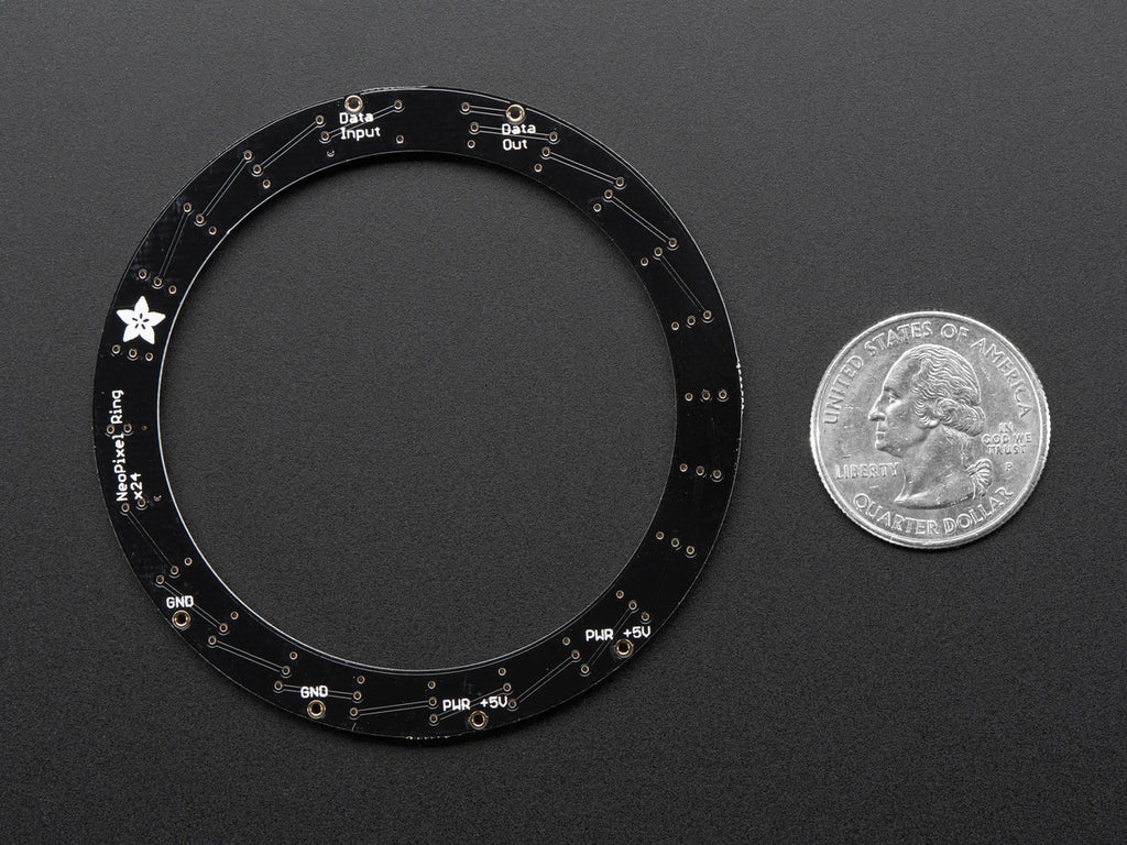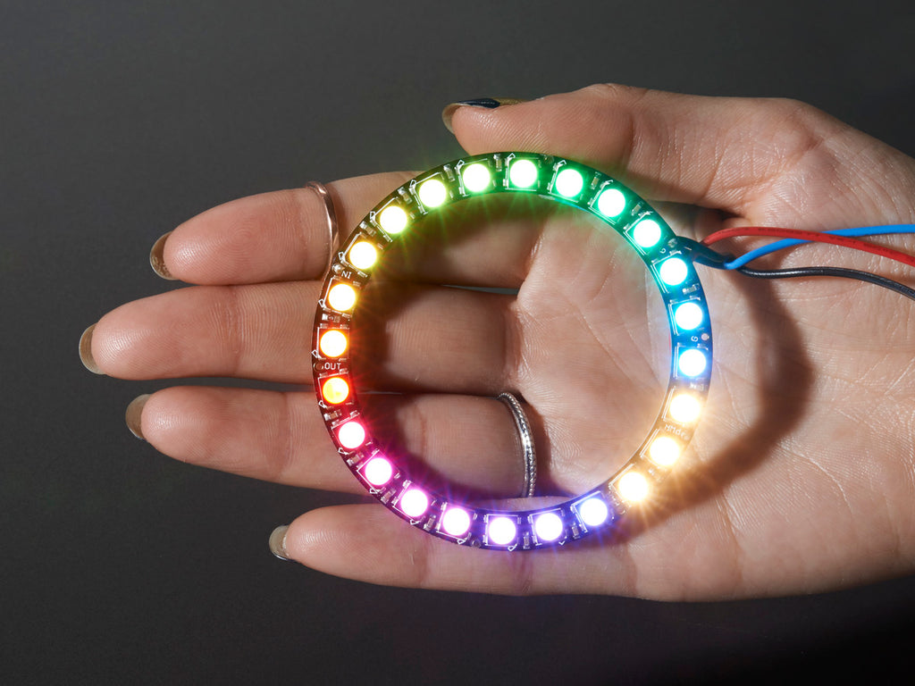 24 ultra bright smart LED NeoPixels are arranged in a circle with 2.58" (65.5mm) outer diameter. The rings are 'chainable' - connect the output pin of one to the input pin of another. Use only one microcontroller pin to control as many as you can chain together! Each LED is addressable as the driver chip is inside the LED. Each one has ~18mA constant current drive so the color will be very consistent even if the voltage varies, and no external choke resistors are required making the design slim. Power the whole thing with 5VDC and you're ready to rock.