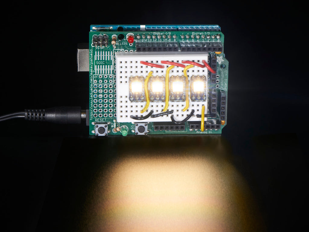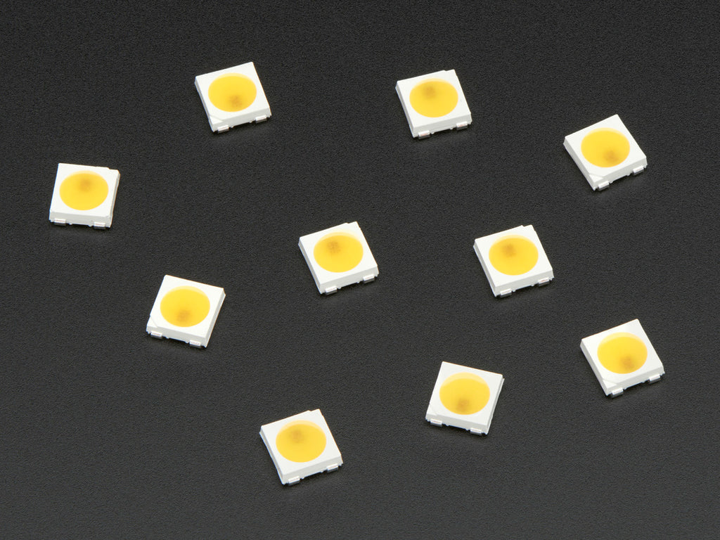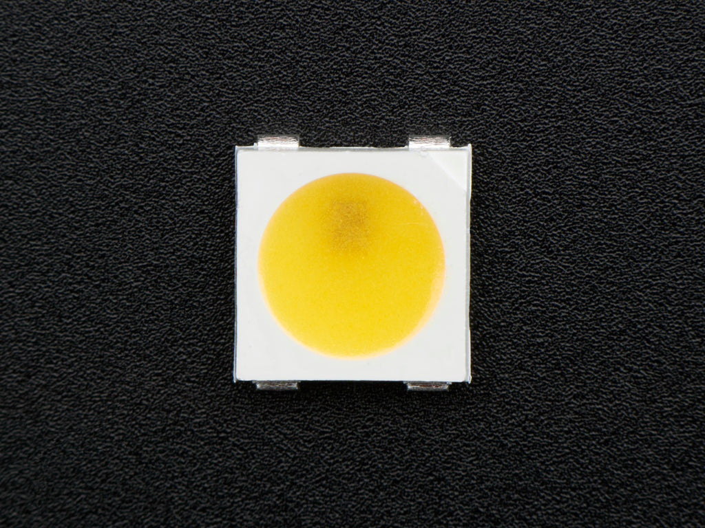 For those of us who are maybe a little tired of rainbows, we now have 'smart LEDs' in monochrome! Make your own smart Warm White LED arrangement with the same integrated LED driver that is used in our NeoPixel LED strips. Unlit, the color resembles an egg yolk. Lit up these are insanely bright (like ow my eye hurts) and can be controlled with 24 bit high-frequency PWM. The phosphor helps diffuse the 3 white dies inside together for a very bright but consistant light, compared to what you get by trying to mix RGB to make white (which never quite looks right)
