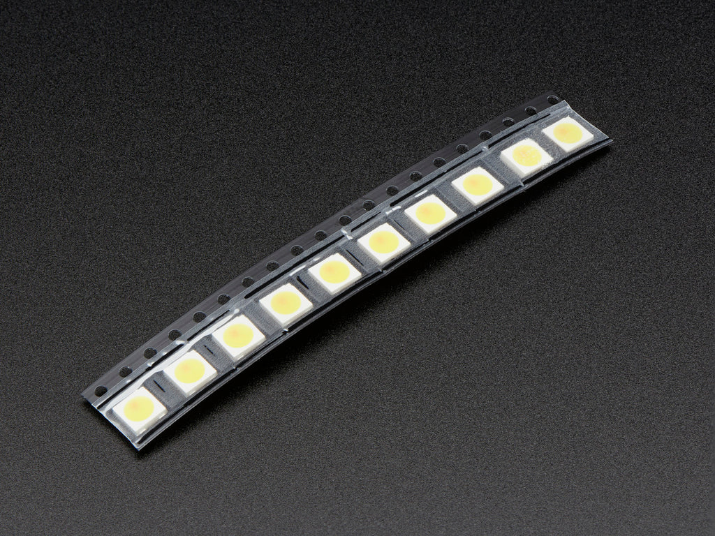 This tiny 5050 (5mm x 5mm) SMD LED is fairly easy to solder and is the most compact way possible to integrate multiple bright LEDs to a design. If you want to prototype with these, we recommend our 5050-size LED breakout PCBs, solder them on for a breadboard-friendly package