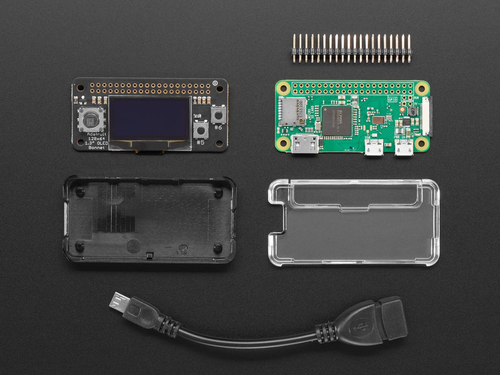- Adafruit 128x64 OLED Bonnet for Raspberry Pi - 128x64 individual white OLED pixels jam-packed into this miniature pi display - even includes a little 5-way joystick and two pushbuttons. Fully assembled - no soldering at all is required for this item