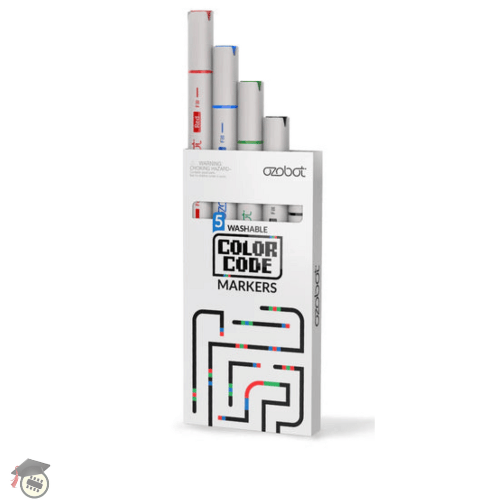 Ozobot's 5-pack of washable markers offer all the necessities to get started with coding. Featuring dual-sided tips, one is thicker with a chisel-tip end for line-drawing and Colour Codes, and the other thin with a fine-point end for filling.