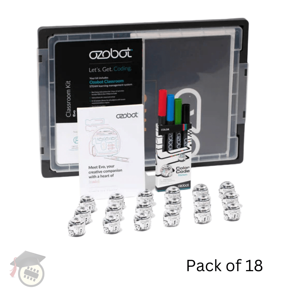 The Evo Classroom Kit comes with 18 Evo robots and accessories. K-12 students can code Evo two ways: screen-free with Colour Code markers and online with Ozobot Blockly visual programming. Ozobot Classroom software unlocks teacher training and free access to hundreds of lessons in our lesson library.