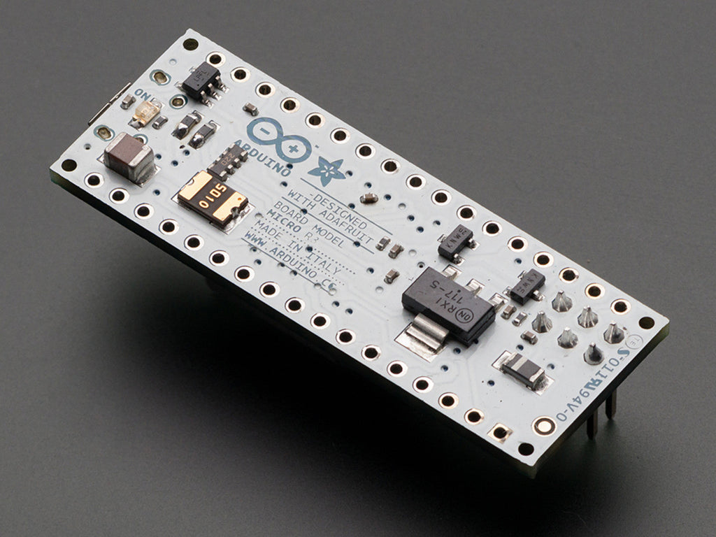 Onboard is the processor, crystal, micro USB connection with fuse, Reset button, ISP low-level reprogramming header, ON LED, TX and RX LEDs, a extra user pin #13 LED, and a 3.3V regulator. You'll probably also want to pick up a micro-B USB cable to connect this board to your computer