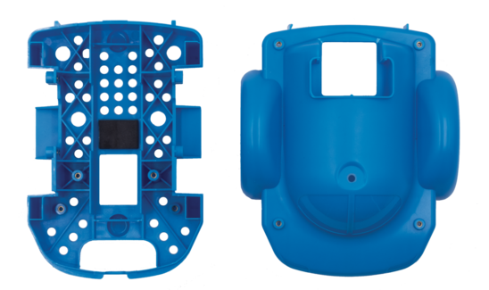 This product contains the top plastic shell, bottom plastic shell, and internal plastic hold-down that comprise the PASCObot body. Includes hold-down mounting screws and a thumbscrew to secure the top and bottom shells.