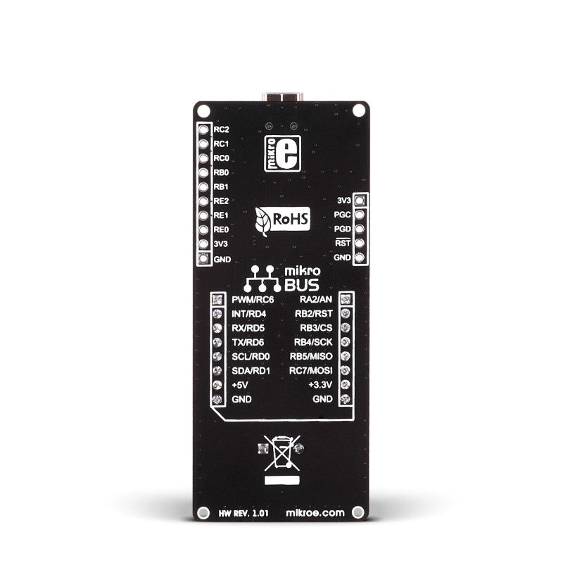 mikroBUS™ is specially designed pinout standard with SPI, I2C, Analog, UART, Interrupt, PWM, Reset and Power supply pins. See Standard Specification.