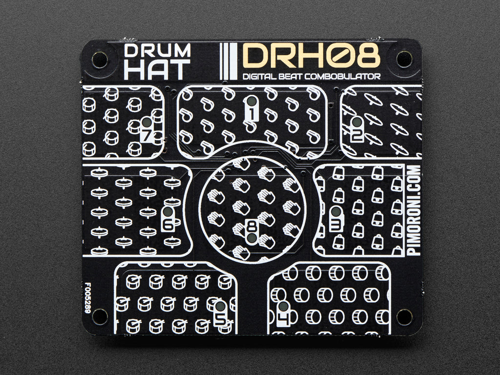 This HAT comes with 8 finger-sized capacitive touch sensor drum pads. Each pad on Drum HAT can be individually watched in Python and hooked up to whatever mad-cap contraption or project you can imagine.
