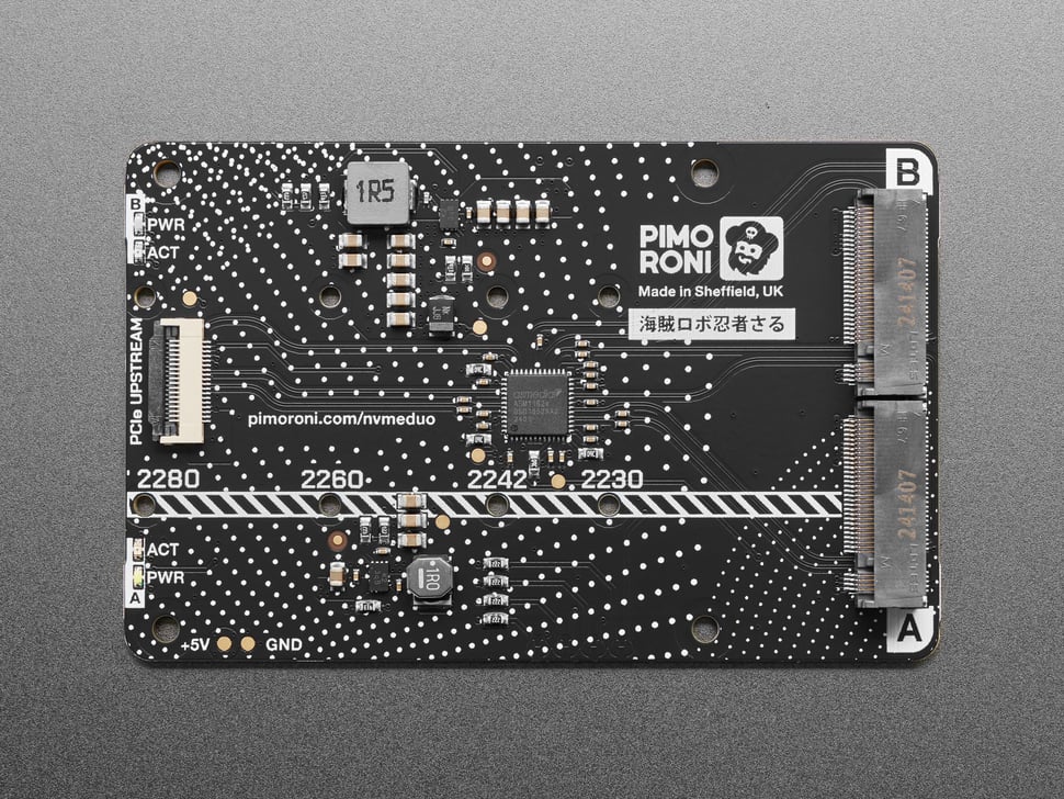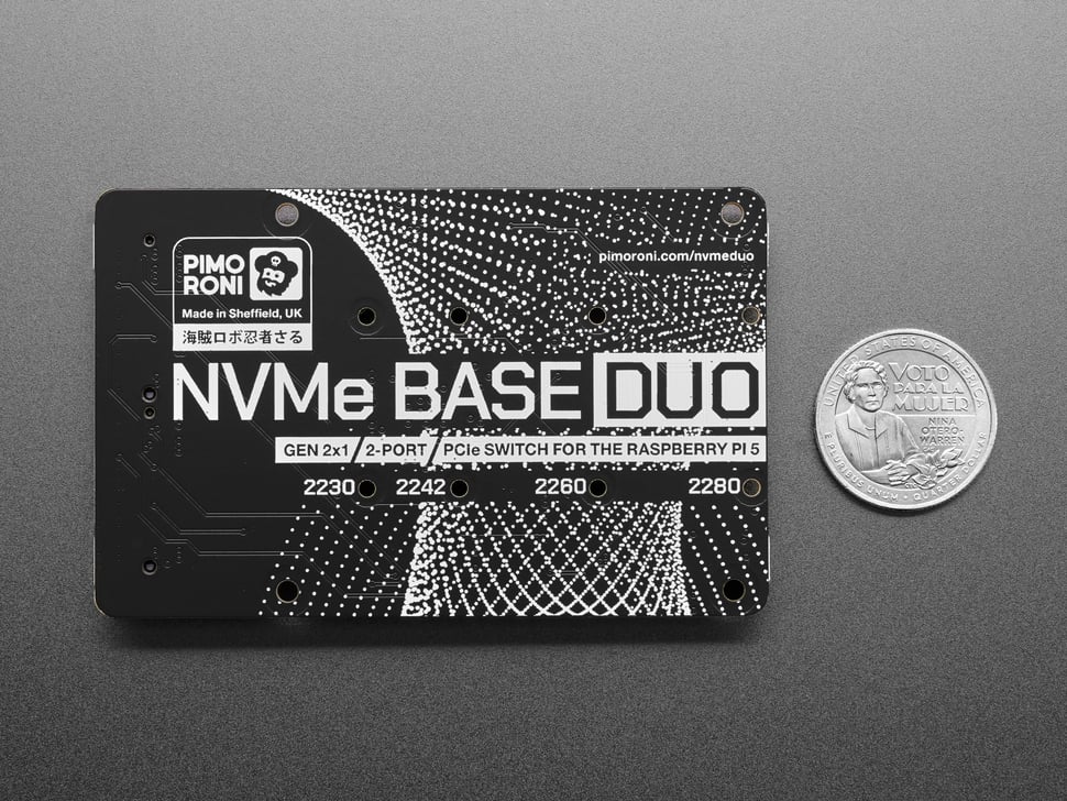 Add two super-fast NVMe SSDs to your Raspberry Pi 5! Ideal if you need redundancy or just a load more storage on your RPi. Pimoroni's NVMe Base Duo is a PCIe Gen 2 extension board for Raspberry Pi 5. To use it, simply populate it with one or two M-key NVMe SSDs (2230 to 2280 sizes supported) and mount it under (or over) your Pi for a compact and fast storage solution. It even comes with rubber feet!