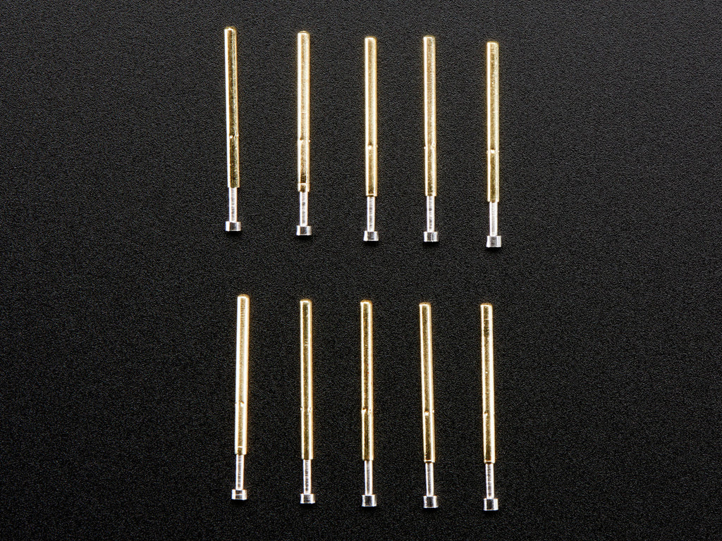 Pogo pins are little spring-loaded contacts, very handy for making jigs, or making momentary (but electrically solid) contacts. We use them by the dozen for making programming and testing jigs but they're handy also if say you want to JTAG program a board that you cant solder headers to - just shove these thin contacts into a 0.1" pitch IDC programming cable and press it onto the contacts.