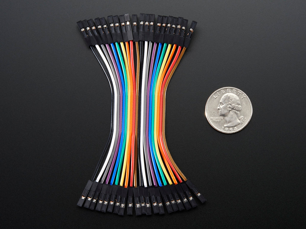 These female-female premium jumper wires are handy for making wire harnesses or jumpering between headers on PCB's. They're 3" (75mm) long and come in a 'strip' of 20 (2 pieces of each of ten rainbow colors). They have 0.1" female header contacts on either end and fit cleanly next to each other on standard-pitch 0.1" (2.54mm) header. The best part is they come in a 20-pin ribbon cable. You can always pull the ribbon wires off to make individual jumpers, or keep them together to make neatly organized wire harnesses.