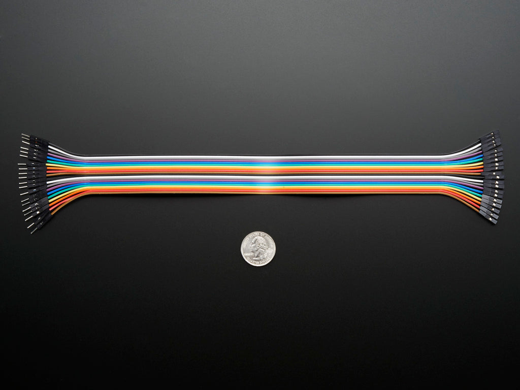 These Female/Male 'Extension' Jumper Wires are handy for making wire harnesses or jumpering between headers on PCB's. These premium jumper wires are 12" (300mm) long and come in a 'strip' of 20 (2 pieces of each of ten rainbow colors). They have 0.1" male header contacts on one end and 0.1" female header contacts on the other. They fit cleanly next to each other on standard-pitch 0.1" (2.54mm) header. The best part is they come in a 20-pin ribbon cable. You can always pull the ribbon wires off to make individual jumpers, or keep them together to make neatly organized wire harnesses.