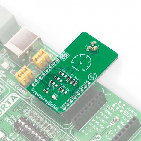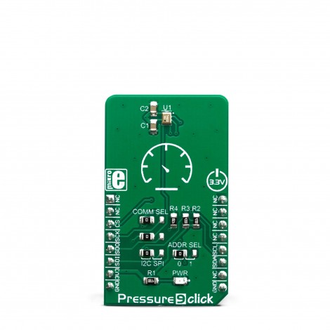 Pressure 9 click supports both SPI and I2C communication interfaces, allowing it to be used with a wide range of different MCUs. The communication interface can be chosen by moving SMD jumpers grouped under the COM SEL to an appropriate position (SPI or I2C). The slave I2C address can also be configured by a SMD jumper, when operated in the I2C mode: a SMD jumper labeled as ADD SEL is used to set the least significant bit (LSB) of the I2C address. When set to 0, the 7-bit I2C slave address becomes 0b1110110x. If set to 1, the address becomes 0b1110111x. The last digit (x) is the R/W bit. Please note that each jumper should be moved to the same position, else the communication with the host MCU may not be possible.