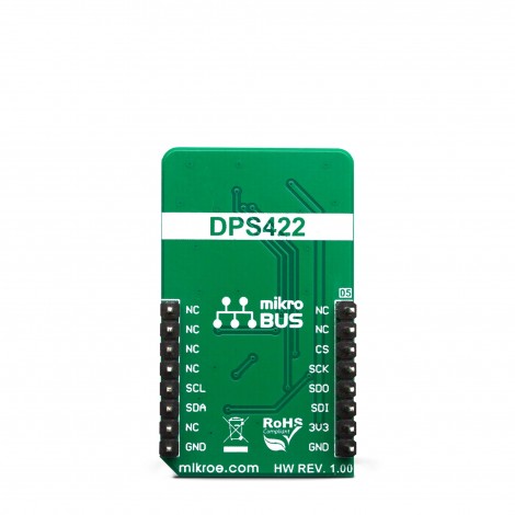 Type Pressure Applications A perfect tool for development of various pressure-based IoT applications, as well as other low-power and space-constrained applications: portable weather stations, room temperature control, applications related to elevation gain and vertical speed detection, sports-related wearables, and similar. On-board modules DPS422, a digital barometric air pressure sensor, by Infineon. Key Features 24-bit conversion, high precision, low power consumption, low count of external components required, both pressure and temperature data, factory programmed calibration parameters, perfect for IoT based applications. Interface I2C,SPI Compatibility mikroBUS Click board size M (42.9 x 25.4 mm) Input Voltage 3.3V