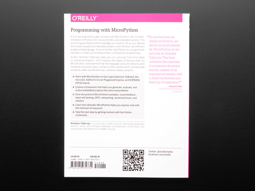 Naomi Ceder, Chair of the Python Software Foundation, praises, "No one has been as deeply involved in, nor shown as much passion for, MicroPython on the micro:bit as Nicholas Tollervey. This book combines the expertise of a seasoned developer and the wisdom of an experienced teacher with a child's excitement and sheer joy of exploration."