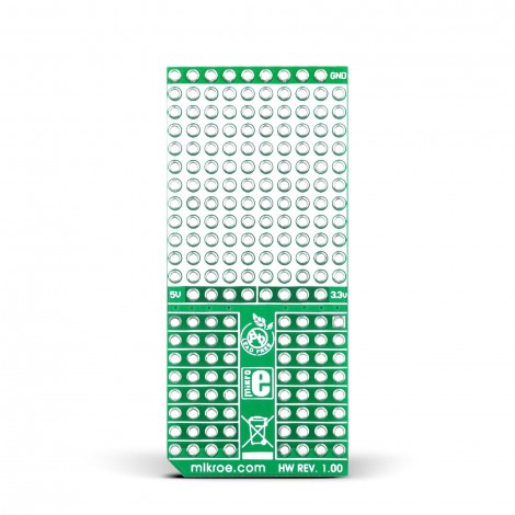 PROTO Click is an accessory Click board™ used as a construction base for prototyping electronics with a mikroBUS™ pins expansion. It allows you to add sensors, drivers, and passive components and make this Click board™ in a way that suits your project needs. It features a 10x11 prototyping area as well as additional power pads (3.3V and 5V power supply pins), providing an easy and elegant solution for adding the external connection capability to the Click board™, plugged on a mikroBUS™ socket.