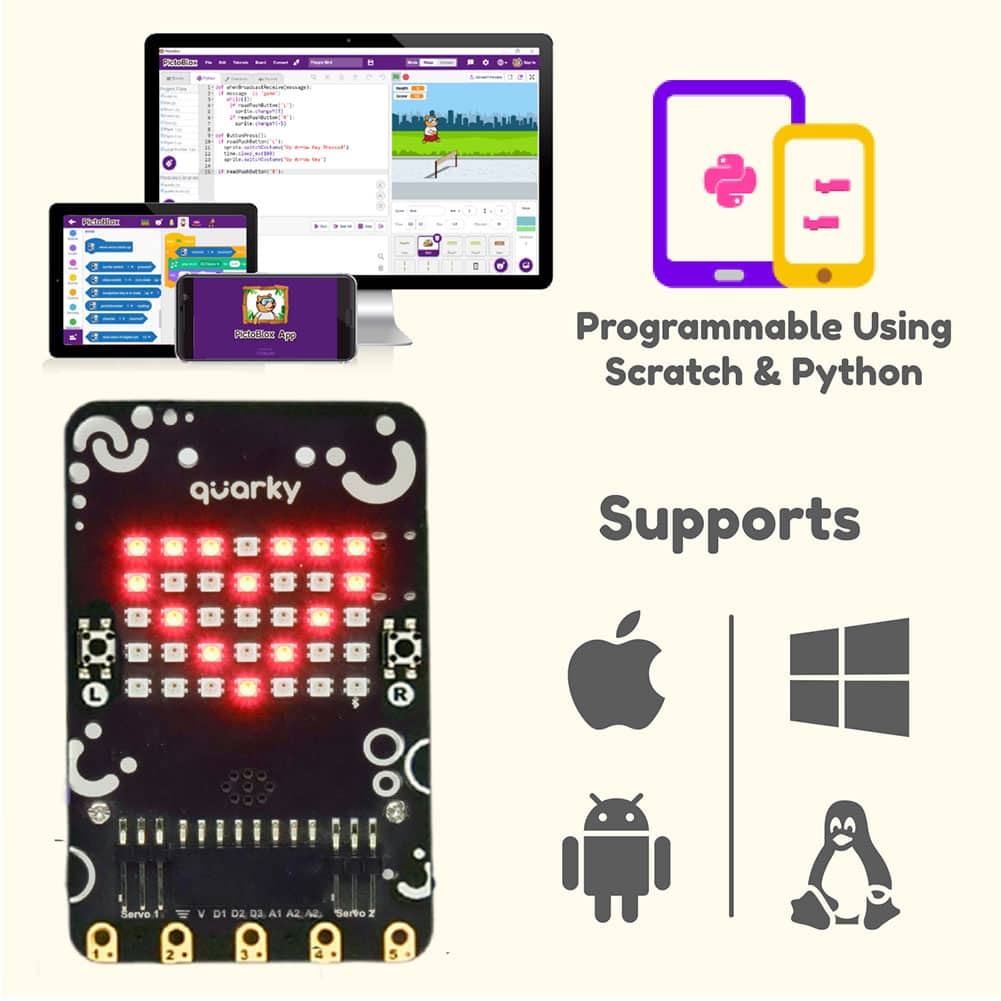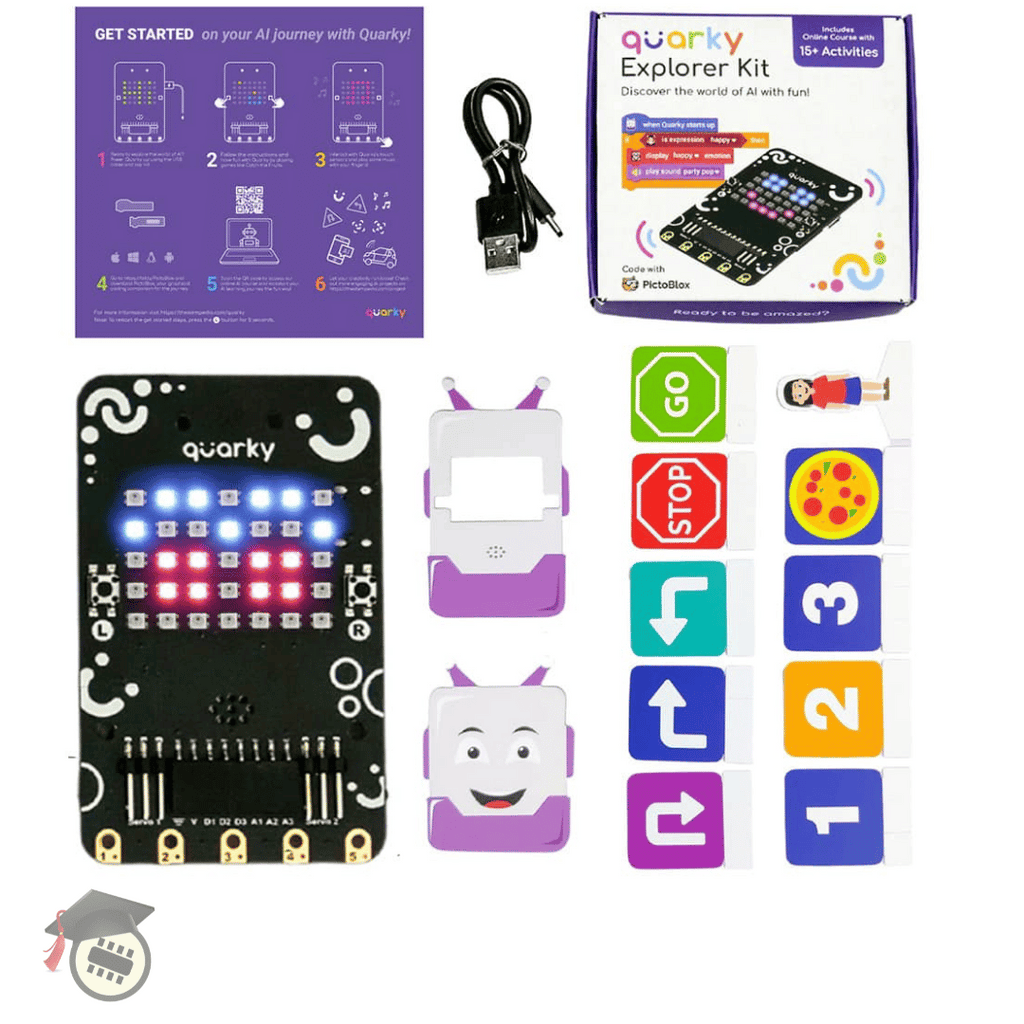• Interactive Self-learning Online Courses: Enhance your learning experience with versatile online courses offered with Quarky Kit for free! [1 on graphical programming and 1 on python programming]