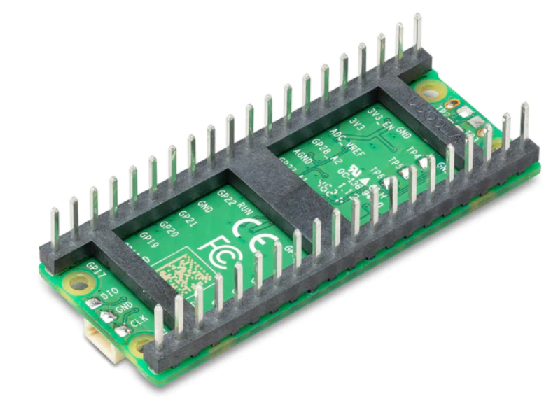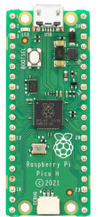 Raspberry Pi Pico H is a version with pre-soldered male headers on all through-holes and a 3-pin debug connector. The pitch remains 2.54mm and is breadboard compatible.
