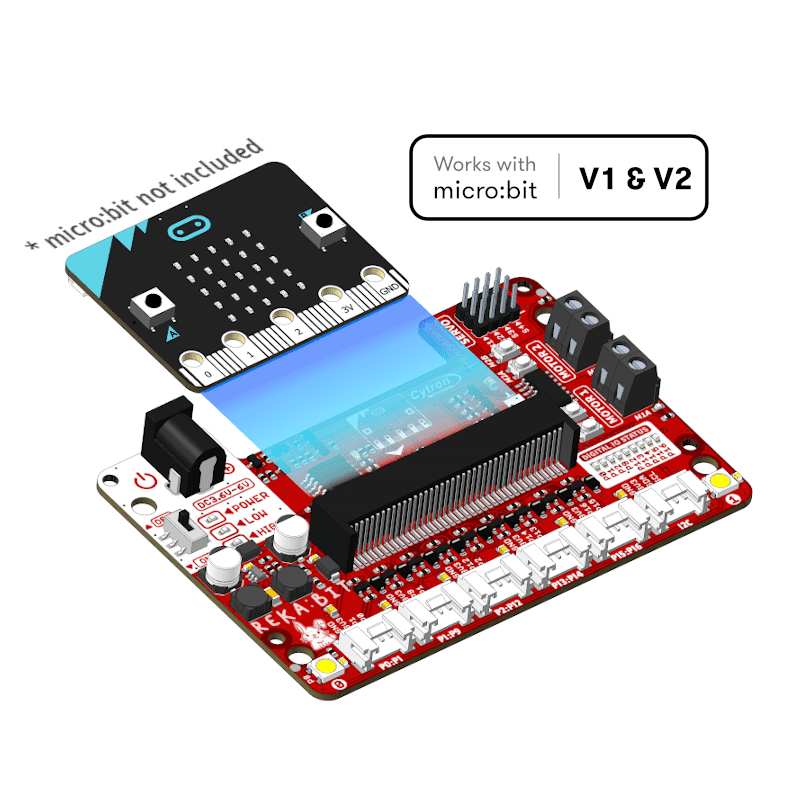 REKA:BIT features a co-processor to handle multi-tasking more efficiently. Playing music while controlling up to 4x servo motors and 2x DC motors, animating micro:bit LED matrix and even lighting up RGB LEDs in different colors, all at the same time, is not a problem for REKA:BIT.