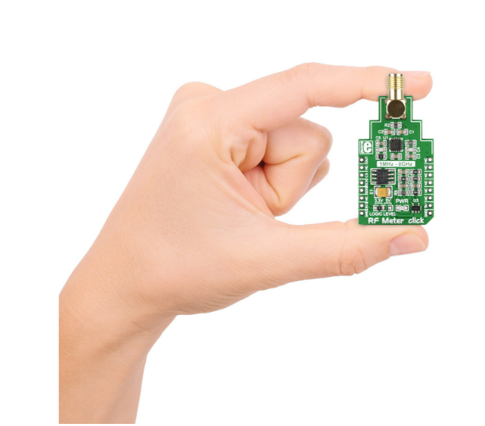 RF Meter Click is based on the AD8318, a logarithmic detector/controller from Analog Devices. It is a demodulating logarithmic amplifier capable of accurately converting an RF input signal to a corresponding decibel-scaled output voltage. It employs the progressive compression technique over a cascaded amplifier chain, with each stage equipped with a detector cell. The AD8318 can be used in measurement or controller mode of operation. It maintains accurate log conformance for signals of 1MHz to 6GHz and provides operation up to 8GHz. The input range is typically 60dB with an error of less than ±1dB and a 10ns response time that enables RF burst detection beyond 45MHz. In addition, the AD8318 comes with an integrated temperature sensor with independent output which can be used as a temperature compensation.