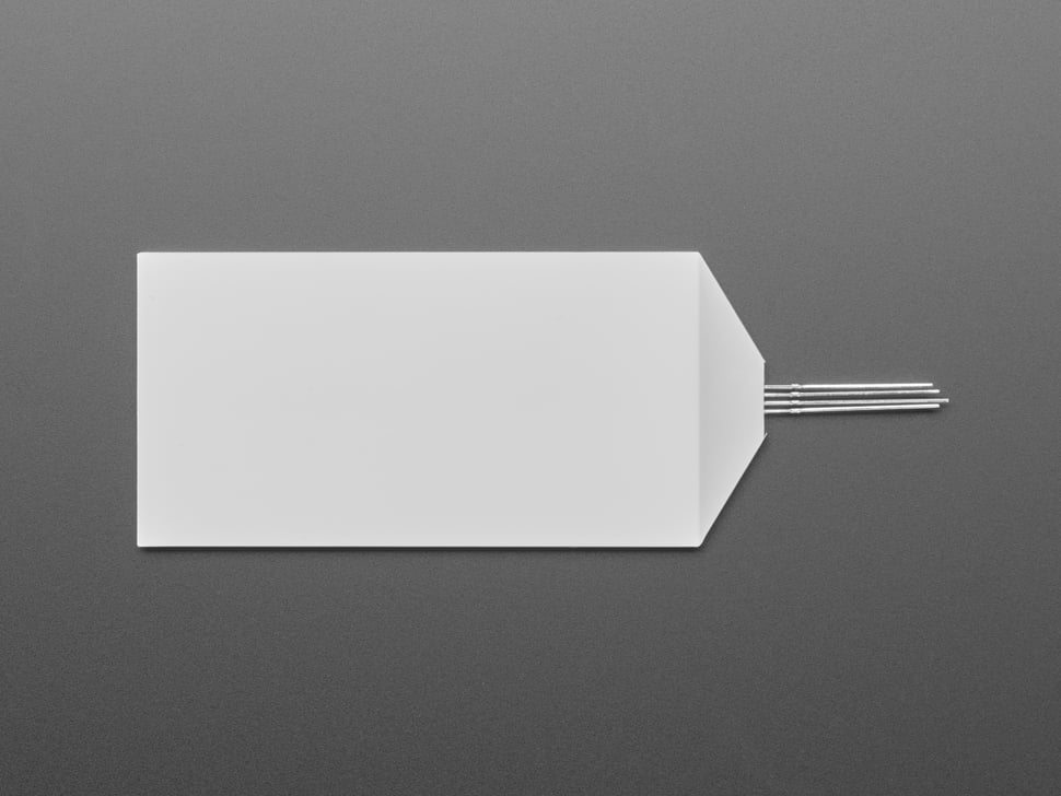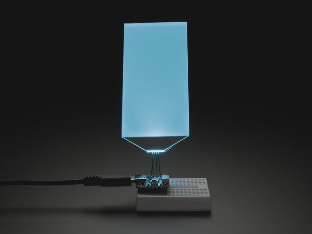 These pretty strips of light are plastic diffused backlights, often seen in LCD displays. Normally they're tucked behind the LCD and shine white light from below. Here, we've got an RGB LED variant available individually, and it's really cool! Each LED is encased in a 3.3mm thick strip of acrylic. The acrylic strip is a special type that is very good at diffusing light, so even though there is only a single LED, it provides near-uniform lighting. The other flat side of the strip has a reflector, so you only get light from the top (otherwise, the backlight would lose 1/2 the brightness unnecessarily).