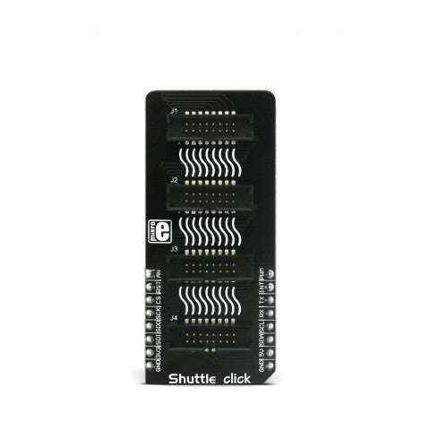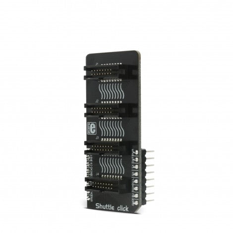 Shuttle click is a mikroBUS™ socket expansion board, which provides an easy and elegant solution for stacking up to four click boards™ on a single mikroBUS™. It is a perfect solution for expanding the capacity of the development system with additional mikroBUS™ sockets when there is a demand for using more click boards™ than the used development system is able to support.