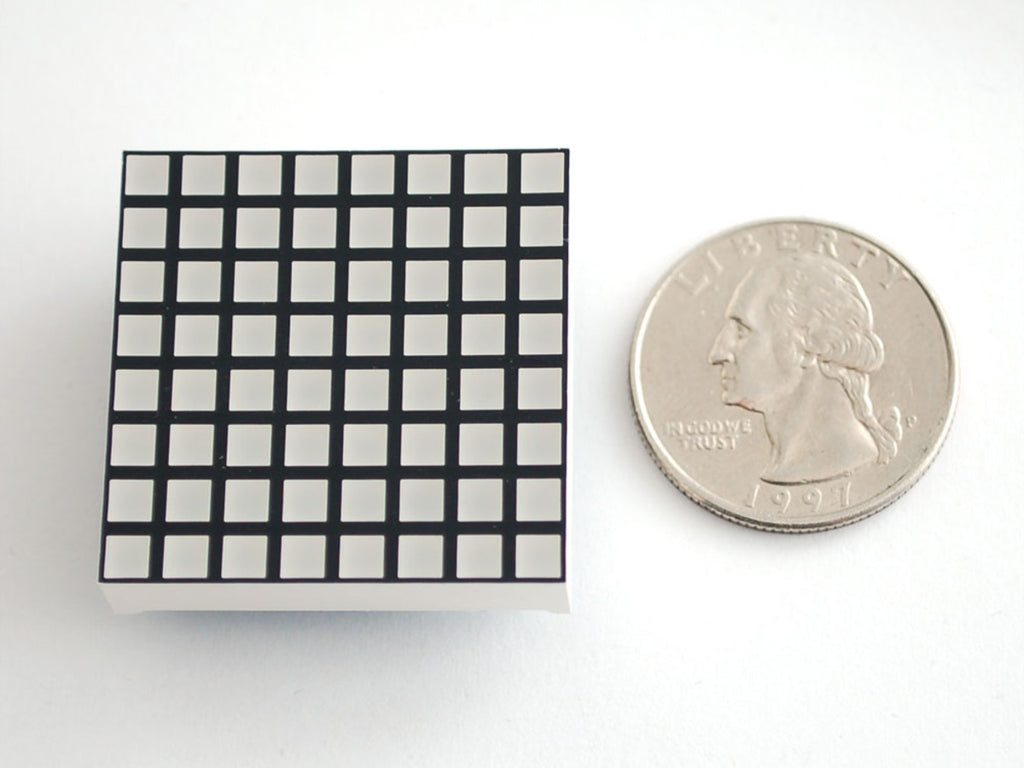 Make a scrolling sign, or a small video display with this 8x8 gridded bi-color LED matrix. Only 1.2" on a side, it is quite visible but not so large it wont plug into a breadboard! Every grid has two LEDs inside so you can have it display red, green, yellow or with fast multiplexing any color in between. This display is bright, beautiful and funky with nice diffused square lenses for a striking look. There are 24 pins on the side, 12 on each, with 0.1" spacing so you can easily plug it into a breadboard with one row on each side for wiring it up.
