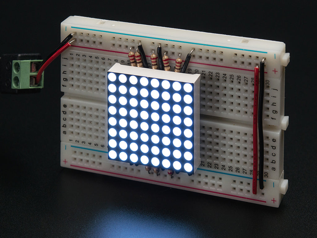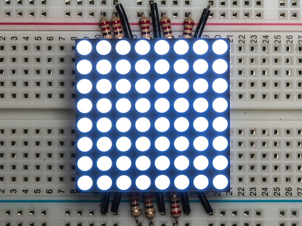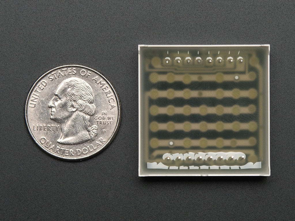 Make a scrolling sign or a small video display with this 8x8 gridded cool white LED matrix. Only 1.2" on a side, it is quite visible but not so large it won't plug into a breadboard! There are 16 pins on the side, 8 on each, with 0.1" spacing so you can easily plug it into a breadboard with one row on each side for wiring it up.