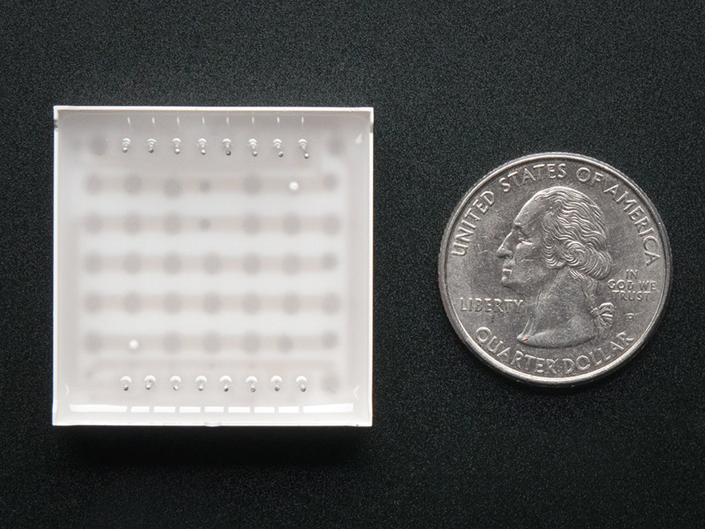 Make a scrolling sign, or a small video display with this 8x8 gridded yellow-green LED matrix. Only 1.2" on a side, it is quite visible but not so large it wont plug into a breadboard! There are 16 pins on the side, 8 on each, with 0.1" spacing so you can easily plug it into a breadboard with one row on each side for wiring it up.