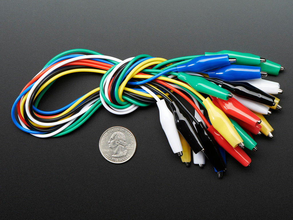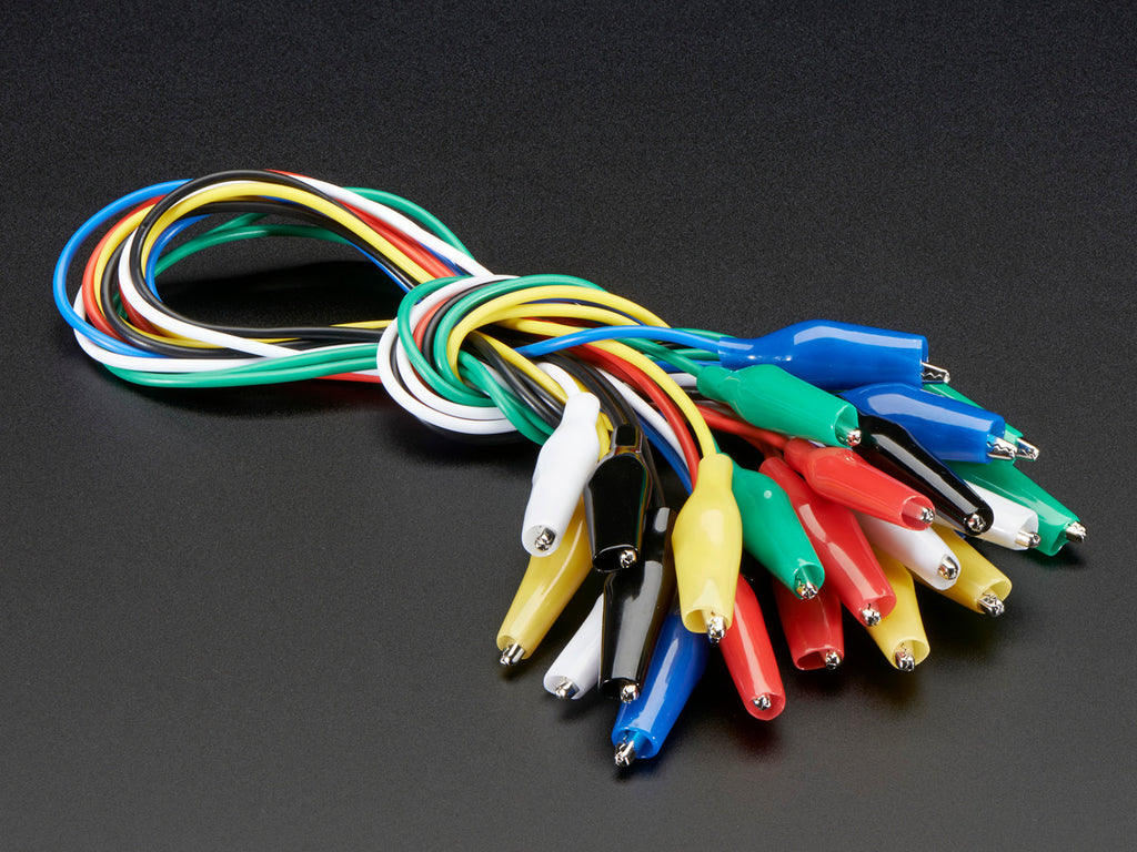 Connect this to that without soldering using these handy mini alligator clip test leads. 15" cables with alligator clip on each end, color coded. You get 12 pieces in 6 colors. Strong and grippy, these always come in handy! We often use these in conjunction with a multimeter so we don't have to hold the probes in place.