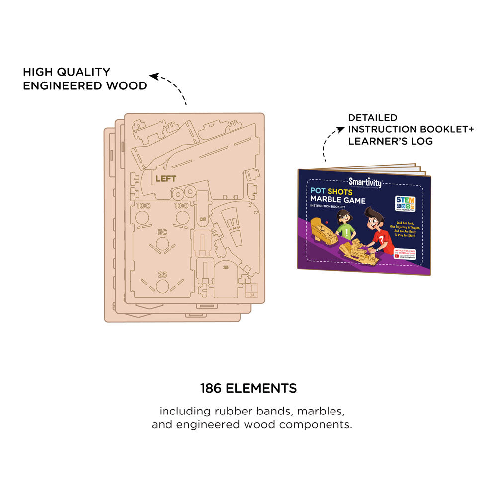 Smartivity Pot Shots Marble game - This is an Educational DIY Activity Kit designed to help children of ages 8 years and older to understand fundamental principles of S.T.E.M. subjects(Science, Technology, Engineering and Mathematics) DIY Time: 70min| Play Time: Unlimited The box contains 186 Elements. STEM Principles Your Child Will Learn Through Play: Projectile motion, Elasticity, Energy transfer, angle deflection Skills Developed: Analytical Skills, Hand-eye coordination, Cognitive Skills, Practical Skills Best S.T.E.M. Educational Gift for Young Minds