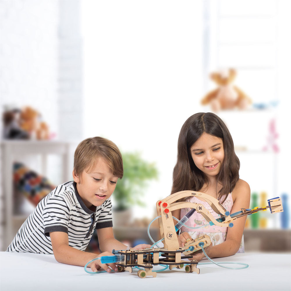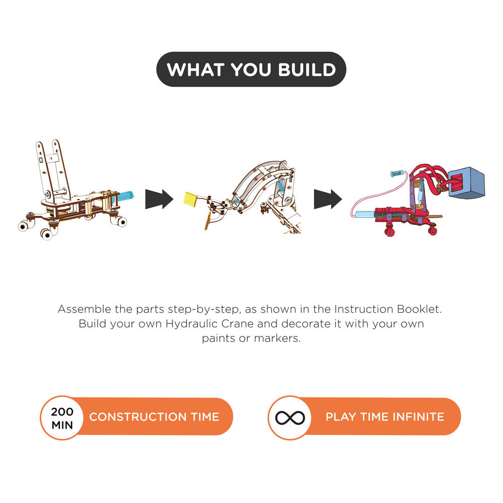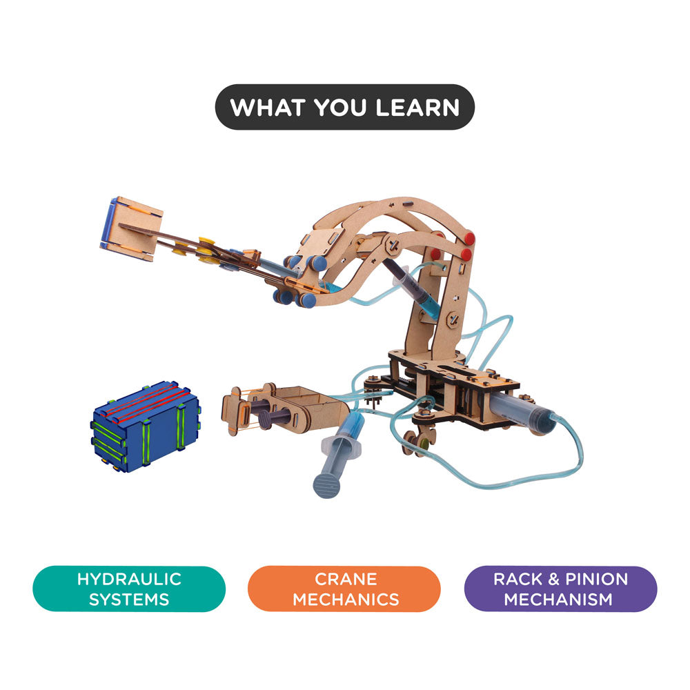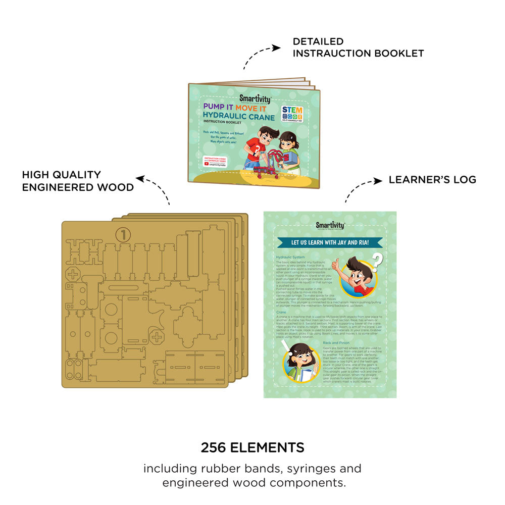 Smartivity Pump It Move It Hydraulic Crane - Help your children understand the basics of hydraulic mechanisms with this amazing S.T.E.M. Learning D.I.Y. project! Hydraulic Machines use the power of water pressure to carry out specified tasks. From cranes to braking mechanisms, hydraulic power finds widespread use in daily life. One of the coolest Smartivity STEM Learning Educational D.I.Y. Toy Kits, the Smartivity Pump It Move It Hydraulic Crane introduces children to the fundamentals of hydraulic machines in the most playful and engagement-filled manner. This kit contains all the elements essential to build a fully-functional hydraulic crane, a richly-illustrated and easy-to-understand step-by-step Instruction booklet and tools to embellish the project once built. Once assembled, children can use their Hydraulic Cranes to lift objects and move them around. The project assembly provides at least an hour-long engagement and the gameplay ensures that children proudly continue to play with the project even after. For Ages: 8 years and older D.I.Y. Time: 60 min | Play Time: Unlimited Skills Developed: Analytical Skills, Creativity, Motor Skills, Practical Skills - (includes richly illustrated, easy-to-understand, step-by-step Instruction Booklet)