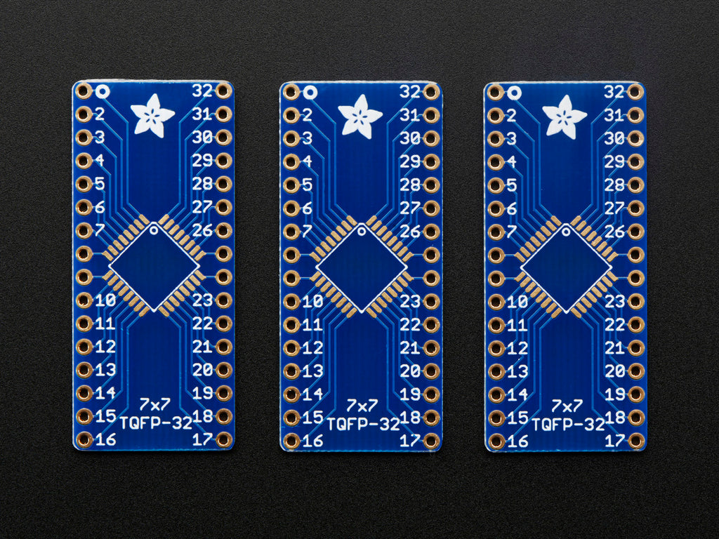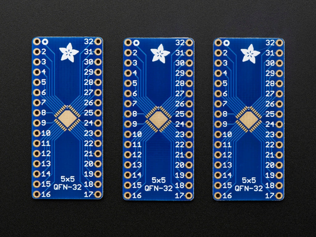 Beguiled by a fancy new chip that is only available in a QFP or QFN pinout? This breakout PCB set will make your life much much easier and get you prototyping faster than ever. One side has a 32-QFP pin out with traces going to two rows of 0.1" spaced holes, the other has 32-QFN. Solder your chip to either side and you're ready to rock on any solderless breadboard.