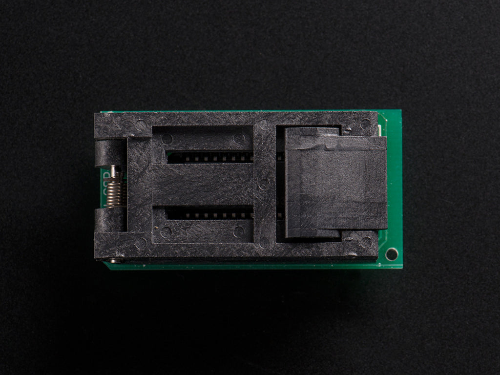 You know those ZIF sockets we have for DIP chips? Well these are just like that but for SMT parts! Yeah, that's right, now you can program and test out your favorite new parts in SOIC Wide packages. This test sockets is good for any wide (300 mil) SOIC/SOP with up to 28 pins. Simply open the latch, place the chip in carefully and then close the top over it. The chip is held securely against gold 'fingers' in the socket.