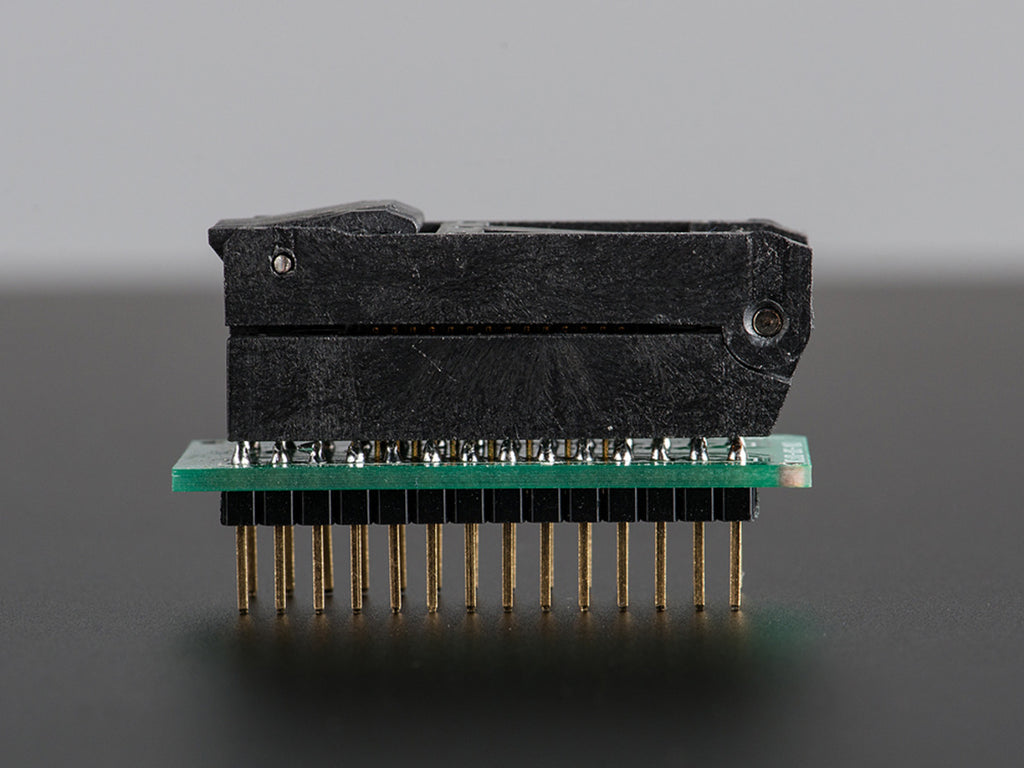 The socket is soldered onto a pair of PCBs that turn it into, essentially, a 28 pin DIP with 0.45" spacing. Unfortunately the .45" is not on a 0.1" spacing but we found that we could bend the pins out and press it into a breadboard without too much difficulty.