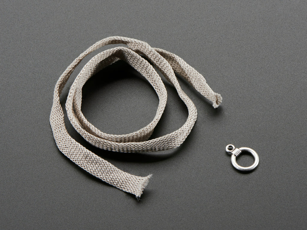 This soft potentiometer is an interesting way to add an adjustable resistor / slide potentiometer to your wearable. You can use it to adjust the brightness of an LED, or as a sensor input to your Flora or Gemma. When the ring slides up and down the ribbon, the resistance from the end of the ribbon to ring will vary from ~100 ohms to about 8Kohm.